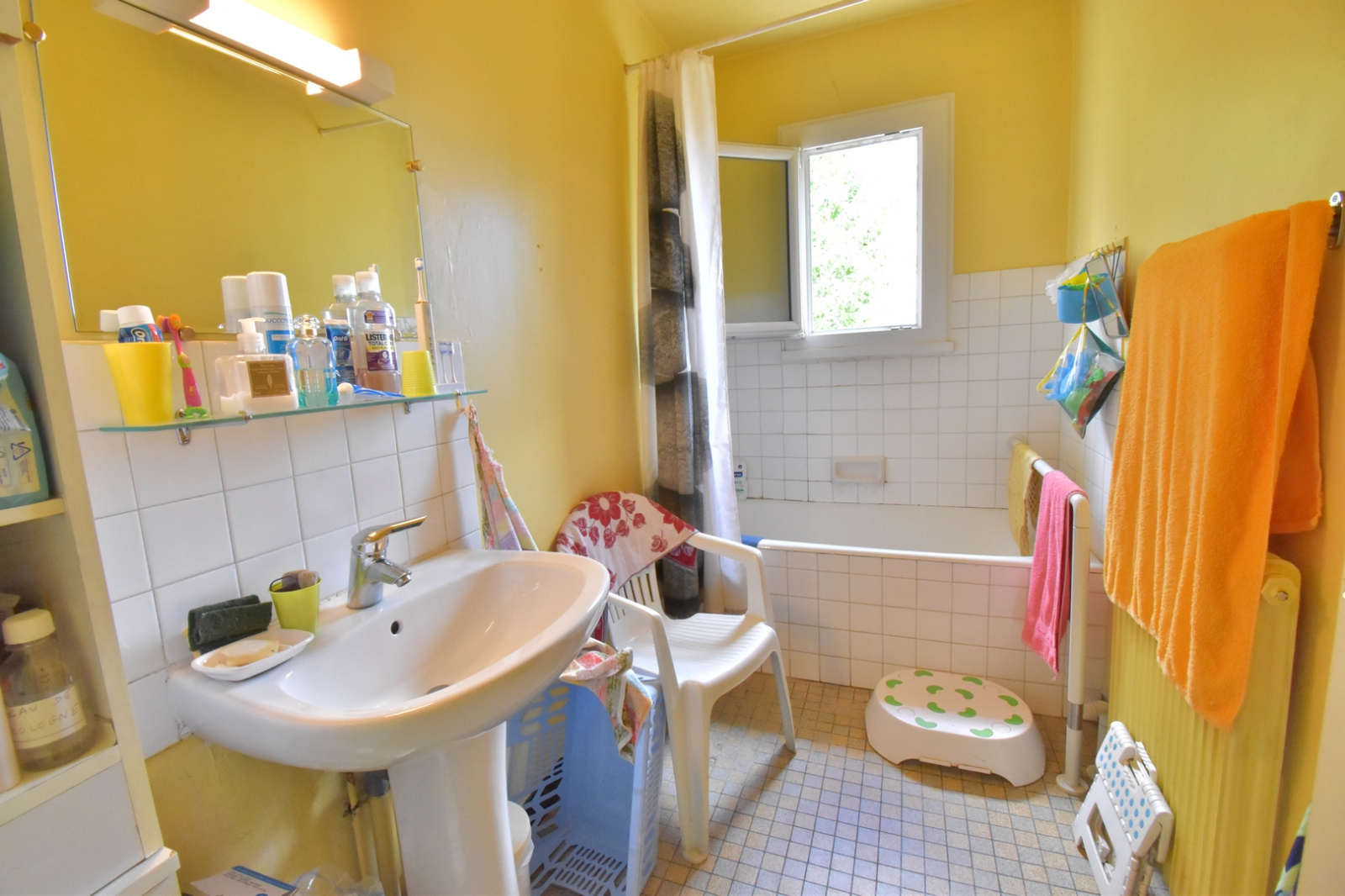 Maison sur sous-sol composé d'une entrée, une cuisine, une salle à manger - salon donnant sur un balcon exposé sud avec stores bannes, deux chambres dont une donnant sur le balcon, une salle d'eau, un wc.