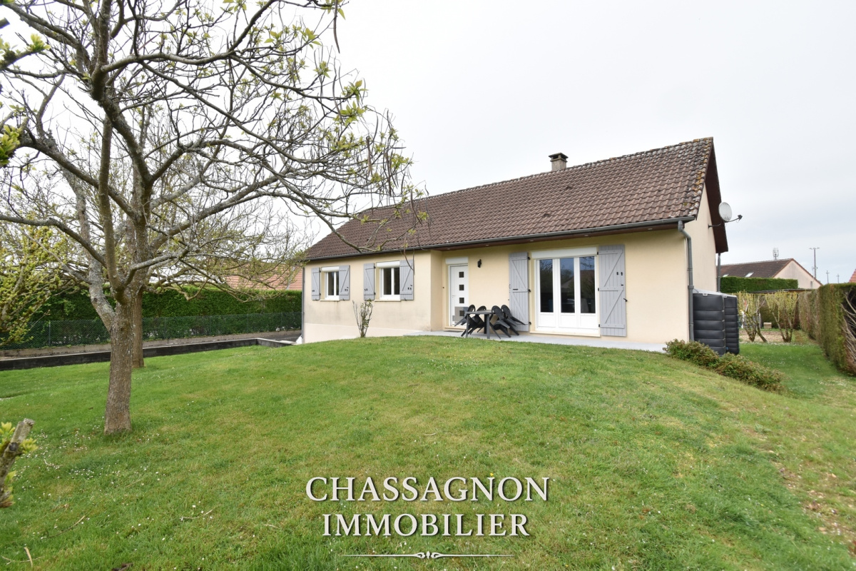 Maison de plain-pied composée d'une entrée, un spacieux séjour-salon avec cheminée, une cuisine équipée et aménagée, 3 chambres, une salle d'eau, un wc.